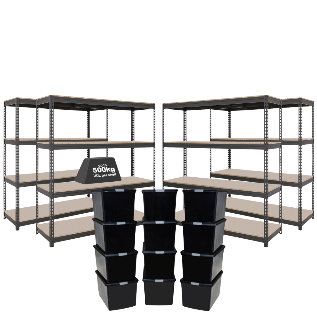 - Four pack of our best selling CRW heavy duty shelving units with our strong, durable Wham DIY storage boxes