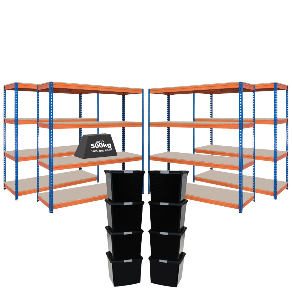 - 4 pack of our best selling CRW heavy duty shelving units with our strong and durable Wham DIY storage boxes