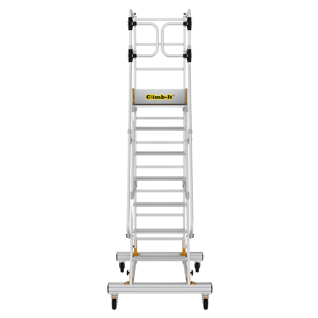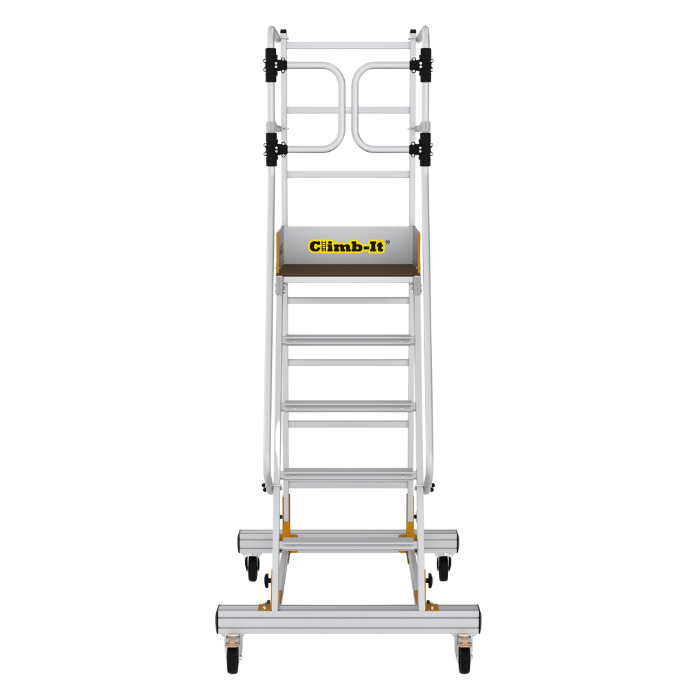 The platform features a wide non-slip surface with kick board for safe and comfortable standing, supported by wide non-slip treads for secure access. A fully enclosed platform with spring gates adds all-round protection for peace of mind. Mobility is enhanced by four braked swivel castors, while the platform supports up to 150kg for heavy-duty performance.